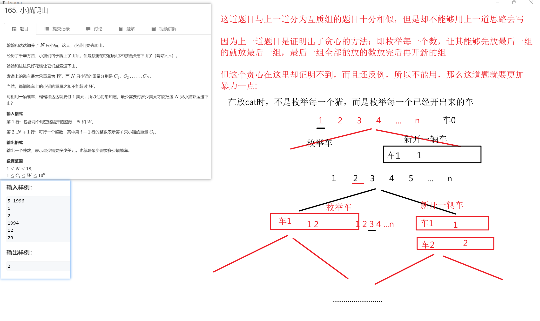 1 #include <iostream> 2 #include <algorithm> 3 #include <cstring> 4 using namespace std; 5 const int N = 20; 6 int n, w; 7 int g[N], cars[N], cnt; 8 int ans; 9 bool rule(int a, int b) 10 { 11 return a > b; 12 } 13 void dfs(int u, int k)//第一个参数是现在开了第...个车,第二个参数是先枚举到了第...层(第...个猫) 14 { 15 if (u >= ans)//最优化剪枝 16 return; 17 if (k > n) 18 { 19 ans = u; 20 return; 21 } 22 for (int i = 1; i <= u; i++) 23 { 24 if (cars[i] + g[k] <= w)//可行性剪枝 25 { 26 cars[i] += g[k]; 27 dfs(u, k + 1); 28 cars[i] -= g[k]; 29 } 30 } 31 cars[u + 1] = g[k]; 32 dfs(u + 1, k + 1); 33 cars[u + 1] = 0; 34 } 35 int main() 36 { 37 cin >> n >> w; 38 ans = n; 39 for (int i = 1; i <= n; i++) 40 cin >> g[i]; 41 sort(g + 1, g + n + 1, rule);//优化搜索顺序(从最大的猫开始枚举可以大大减少分支) 42 dfs(1, 1);//同时我这里用了组合型递归,减少了冗余项 43 cout << ans; 44 return 0; 45 }