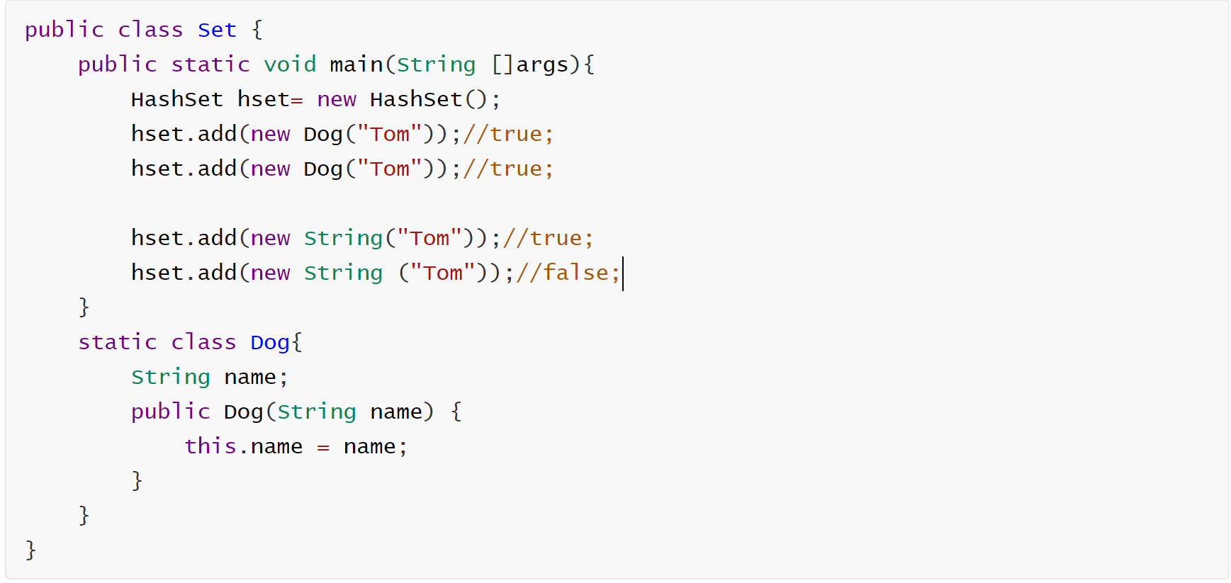 10 hset.add(new Dog("tom", 18));