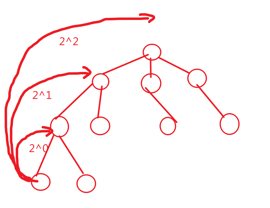 那么x也一定能由2的倍数拼凑出来,我们可以枚举for (int i=logN;i>=0;i--) 表示跳2^i个点(i<=logN的原因是跳2^logN个点会超过树上的全部点)