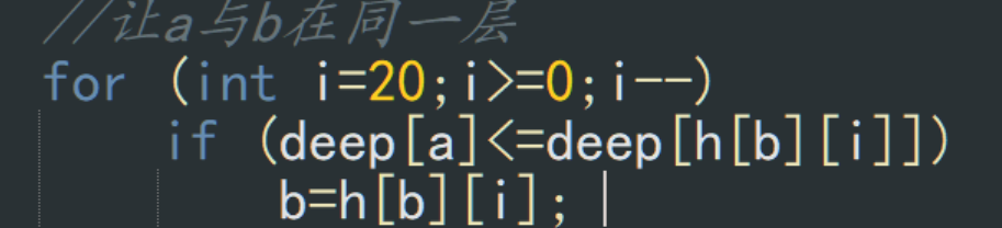 if depth[f[a][i]]<=depth[b]; 那么:a=f[a][i];
