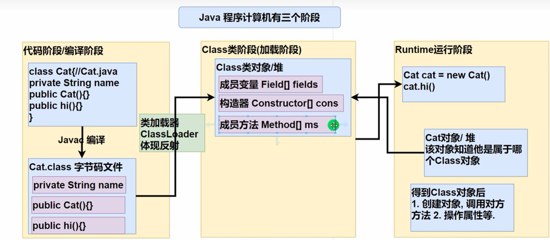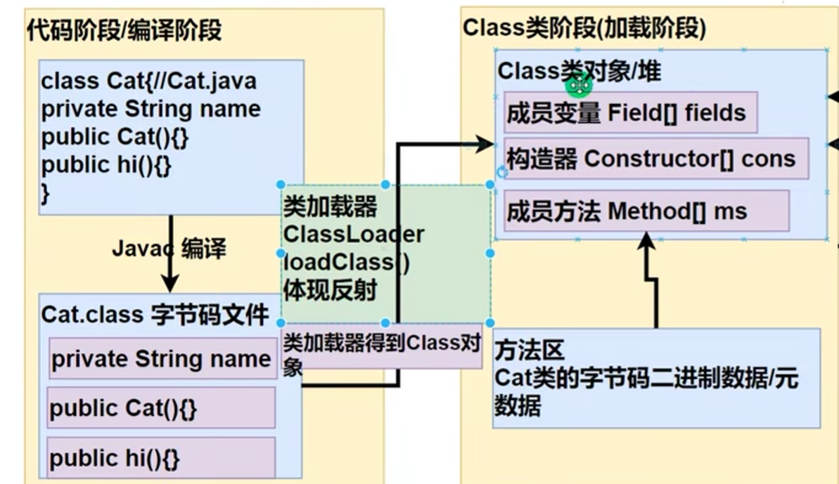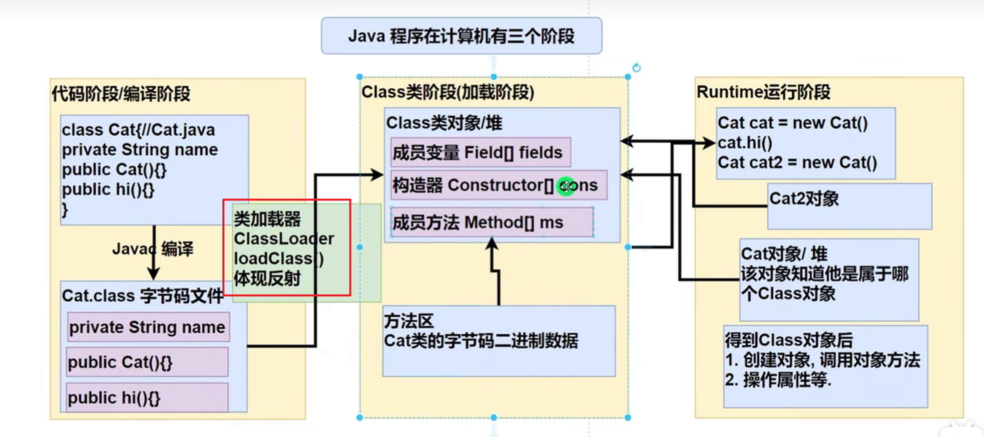 在javac编译过后通过类加载器ClassLoader生成Class类,完成后可得到Cat对象