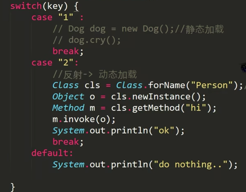 我用反射动态加载,则编译不会报错,只有在我输入2,进入到case "2"运行了加载类的语句时才会报错