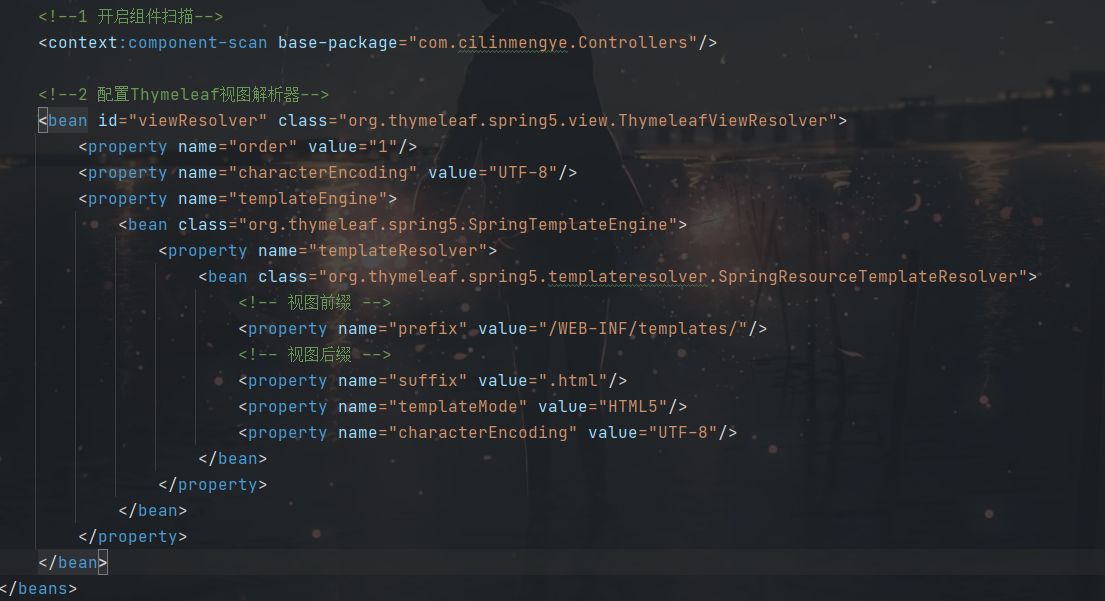 <?xml version="1.0" encoding="UTF-8"?> <beans xmlns="http://www.springframework.org/schema/beans" xmlns:xsi="http://www.w3.org/2001/XMLSchema-instance" xmlns:mvc="http://www.springframework.org/schema/mvc" xmlns:context="http://www.springframework.org/schema/context" xsi:schemaLocation="http://www.springframework.org/schema/beans http://www.springframework.org/schema/beans/spring-beans.xsd http://www.springframework.org/schema/mvc https://www.springframework.org/schema/mvc/spring-mvc.xsd http://www.springframework.org/schema/context https://www.springframework.org/schema/context/spring-context.xsd"> <!--1 开启组件扫描--> <context:component-scan base-package="com.cilinmengye"/> <!--2 配置Thymeleaf视图解析器--> <bean id="viewResolver" class="org.thymeleaf.spring5.view.ThymeleafViewResolver"> <property name="order" value="1"/> <property name="characterEncoding" value="UTF-8"/> <property name="templateEngine"> <bean class="org.thymeleaf.spring5.SpringTemplateEngine"> <property name="templateResolver"> <bean class="org.thymeleaf.spring5.templateresolver.SpringResourceTemplateResolver"> <!-- 视图前缀 --> <property name="prefix" value="/WEB-INF/templates/"/> <!-- 视图后缀 --> <property name="suffix" value=".html"/> <property name="templateMode" value="HTML5"/> <property name="characterEncoding" value="UTF-8"/> </bean> </property> </bean> </property> </bean> <mvc:default-servlet-handler/> <!-- 开启mvc注解驱动 --> <mvc:annotation-driven/> <mvc:view-controller path="/" view-name="index"/> </beans>