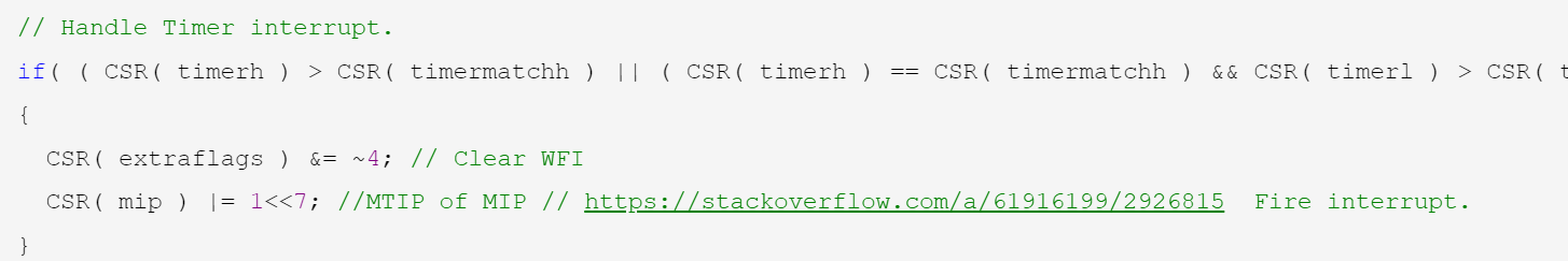 CSR( mip ) |= 1<<7; //MTIP of MIP // https://stackoverflow.com/a/61916199/2926815 Fire interrupt.