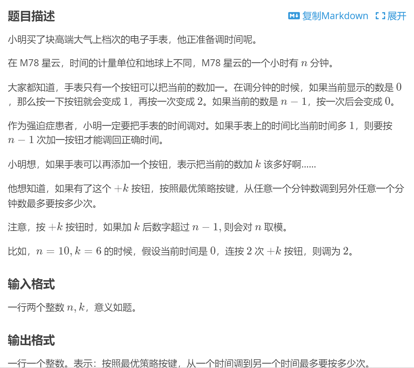 #include<iostream> #include<cstring> #include<algorithm> #include<vector> #include<queue> using namespace std; const int N=1e5+5; int n,k; int arr[N],ans=0,dist[N]; vector<int>sides[N]; bool st[N]; void bfs(int root) { memset(dist,0x3f,sizeof(dist)); queue<int>q; q.push(root); dist[root]=0; while (q.size()) { int node=q.front(); q.pop(); if (st[node]) continue; st[node]=true; ans=max(ans,dist[node]); for (int i=0;i<sides[node].size();i++) { int child=sides[node][i]; dist[child]=min(dist[child],dist[node]+1); q.push(child); } } } int main() { cin>>n>>k; for (int i=0;i<n;i++) arr[i]=i; for (int i=0;i<n;i++) { int to=arr[(i+1)%n],tw=arr[(i+k)%n]; sides[i].push_back(to),sides[i].push_back(tw); } bfs(0); cout<<ans<<endl; return 0; }