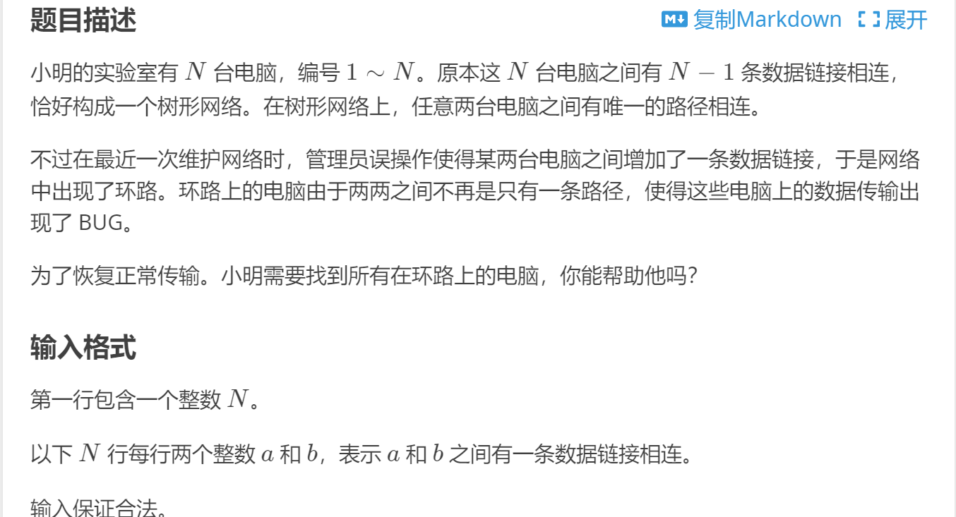 #include<iostream> #include<cstring> #include<algorithm> #include<vector> using namespace std; const int N=1e5+5; int n,from[N],to[N],h[N]; vector<int>sides[N]; int find(int x) { if (h[x]!=x) h[x]=find(h[x]); return h[x]; } bool st[N]; void dfs(int sta,int fin) { if (sta==fin) { for (int i=1;i<=n;i++) if (st[i]) cout<<i<<" "; return ; } for (int i=0;i<sides[sta].size();i++) { int child=sides[sta][i]; if (st[child]) continue; st[child]=true; dfs(child,fin); st[child]=false; } } int main() { cin>>n; for (int i=1;i<=n;i++) { cin>>from[i]>>to[i]; h[i]=i; } for (int i=1;i<=n;i++) { int a=from[i],b=to[i]; int fa=find(a),fb=find(b); if (fa!=fb) { h[fb]=fa; sides[a].push_back(b),sides[b].push_back(a); } else { st[a]=true; dfs(a,b); break; } } return 0; }