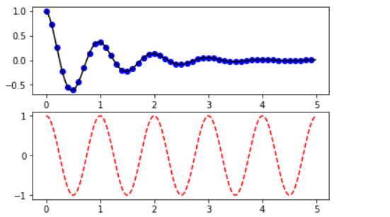 import numpy as np import matplotlib.pyplot as plt def f(t): return np.exp(-t) * np.cos(2*np.pi*t) t1 = np.arange(0.0, 5.0, 0.1) #0.0横坐标开始的点 5.0横坐标结束的点 0.02线条的起伏程度 t2 = np.arange(0.0, 5.0, 0.02) #如果不指定figure()的轴,figure(1)命令默认会被建立, 同样的如果你不指定subplot(numrows,numcols,fignum)的轴,subplot(111)也会自动建立。 #plt.figure(1) plt.subplot(211) plt.plot(t1, f(t1), 'bo', t2, f(t2), 'k') plt.subplot(212) plt.plot(t2, np.cos(2*np.pi*t2), 'r--') plt.show()