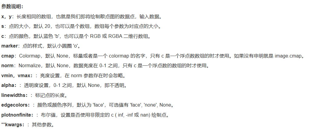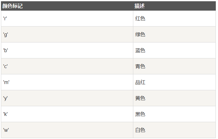 color:'b' 蓝色,'m' 洋红色,'g' 绿色,'y' 黄色,'r' 红色,'k' 黑色,'w' 白色,'c' 青绿色,'#008000' RGB 颜色符串。