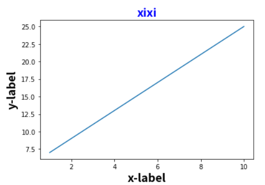 from matplotlib import pyplot as plt import matplotlib zhfont = matplotlib.font_manager.FontProperties(fname="SourceHanSansSC-Bold.otf") x = np.arange(1,11) y = 2*x+5 plt.title("xixi",fontproperties=zhfont) # fontsize 设置字体大小 plt.xlabel("x-label",fontproperties=zhfont) plt.ylabel("y-label",fontproperties=zhfont) plt.plot(x,y) plt.show()