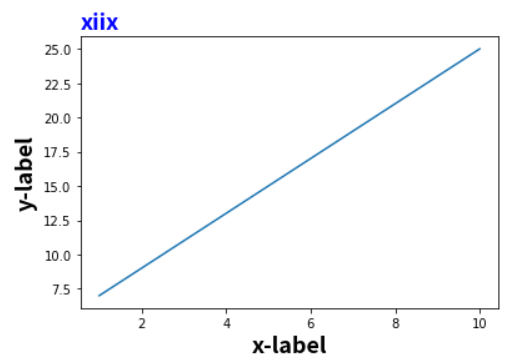 #标题与标签的定位 import numpy as np from matplotlib import pyplot as plt import matplotlib zhfont = matplotlib.font_manager.FontProperties(fname="SourceHanSansSC-Bold.otf" ,size=18) font1 = {'color':'blue','size':20} font2 = {'color':'darkred','size':15} x = np.arange(1,11) y = 2*x+5 plt.title("xiix",fontproperties=zhfont,fontdict=font1,loc="left") #plt.xlabel("x-label",fontproperties=zhfont,loc="left")显示错误?? plt.xlabel("x-label",fontproperties=zhfont) plt.ylabel("y-label",fontproperties=zhfont) plt.plot(x,y) plt.show()