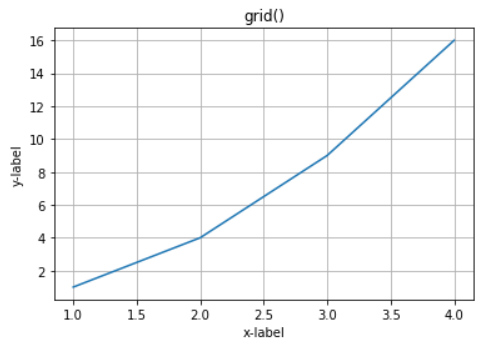 import numpy as np import matplotlib.pyplot as plt x = np.array([1,2,3,4]) y = np.array([1,4,9,16]) plt.title("grid()") plt.xlabel("x-label") plt.ylabel("y-label") plt.plot(x,y) plt.grid() plt.show()