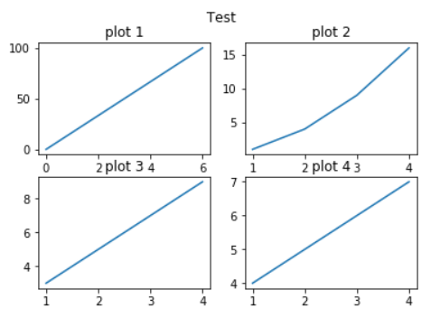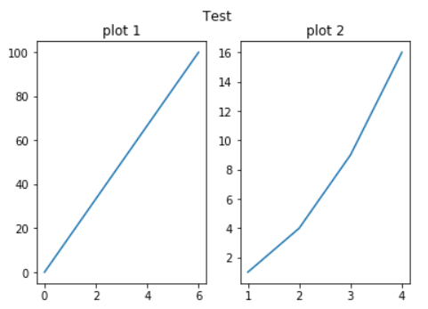 import matplotlib.pyplot as plt import numpy as np xpoints = np.array([0,6]) ypoints = np.array([0,100]) #plot 1 plt.subplot(1,2,1) plt.plot(xpoints,ypoints) plt.title("plot 1") #plot 2 x = np.array([1,2,3,4]) y = np.array([1,4,9,16]) plt.subplot(1,2,2) plt.plot(x,y) plt.title("plot 2") plt.suptitle("Test") plt.show(