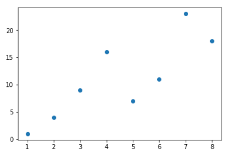 import matplotlib.pyplot as plt import numpy as np x = np.array([1,2,3,4,5,6,7,8]) y = np.array([1,4,9,16,7,11,23,18]) plt.scatter(x,y) plt.show()