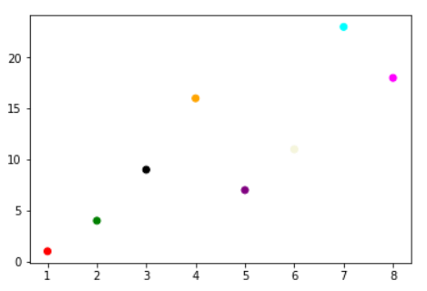x = np.array([1,2,3,4,5,6,7,8]) y = np.array([1,4,9,16,7,11,23,18]) colors = np.array(['red','green','black','orange','purple','beige','cyan','magenta']) plt.scatter(x,y,c=colors) plt.show()