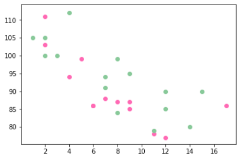 import matplotlib.pyplot as plt import numpy as np x = np.array([5,6,8,7,2,17,2,9,4,11,12,9,6]) y = np.array([99,86,87,88,111,86,103,87,94,78,77,85,86]) plt.scatter(x,y,color='hotpink') x = np.array([2,2,8,1,15,8,12,9,7,3,11,4,7,14,12]) y = np.array([100,105,84,105,90,99,90,95,94,100,79,112,91,80,85]) plt.scatter(x,y,color='#88c999') plt.show()