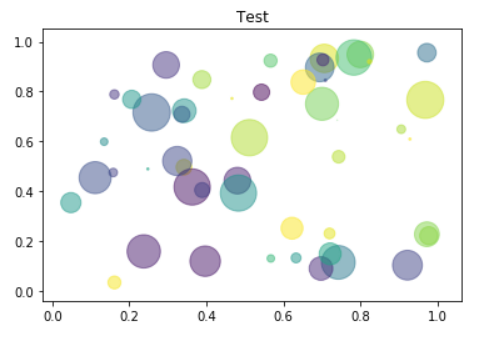 #随机数生成器的种子 np.random.seed(19680801) N = 50 x = np.random.rand(N) y = np.random.rand(N) colors = np.random.rand(N) area = (30 * np.random.rand(N))**2 plt.scatter(x,y,s = area,c = colors,alpha=0.5) plt.title("Test") plt.show()