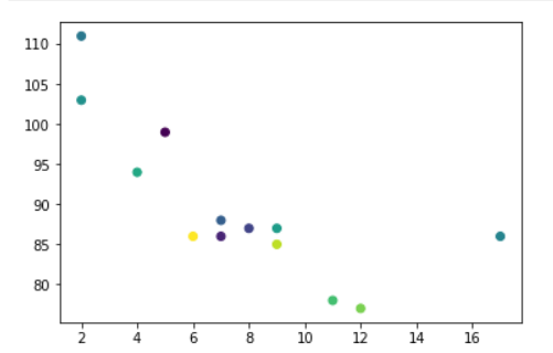 x = np.array([5,7,8,7,2,17,2,9,4,11,12,9,6]) y = np.array([99,86,87,88,111,86,103,87,94,78,77,85,86]) colors = np.array([0,10,20,30,40,45,50,55,60,70,80,90,100]) plt.scatter(x,y,c=colors,cmap='viridis') plt.show()