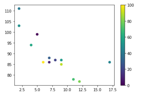 x = np.array([5,7,8,7,2,17,2,9,4,11,12,9,6]) y = np.array([99,86,87,88,111,86,103,87,94,78,77,85,86]) colors = np.array([0,10,20,30,40,45,50,55,60,70,80,90,100]) plt.scatter(x,y,c=colors,cmap='viridis') plt.colorbar() plt.show()