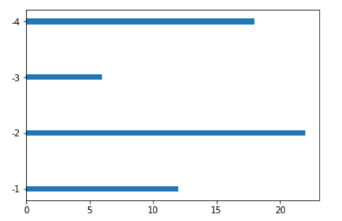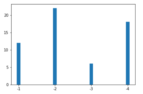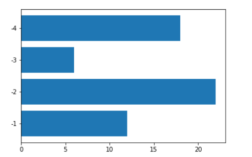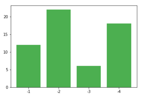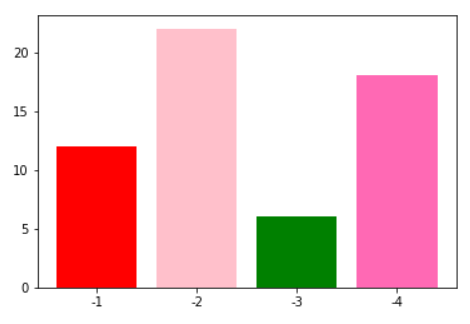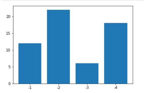 import matplotlib.pyplot as plt import numpy as np x = np.array(['-1','-2','-3','-4']) y = np.array([12,22,6,18]) plt.bar(x,y) plt.show()