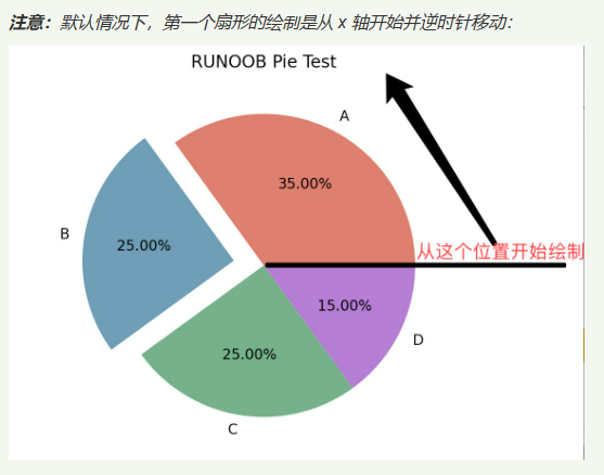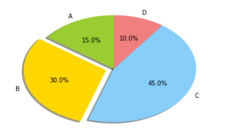 sizes = [15,30,45,10] labels = ['A','B','C','D'] colors = ['yellowgreen','gold','lightskyblue','lightcoral'] #突出显示第二个扇形 #定义了一个包含 4 个元素的元组 explode,它用来指定是否突出某个扇形 explode = (0,0.1,0,0) plt.pie(sizes,explode = explode,labels=labels,colors=colors, autopct="%1.1f%%",shadow=True,startangle=90) plt.show()
