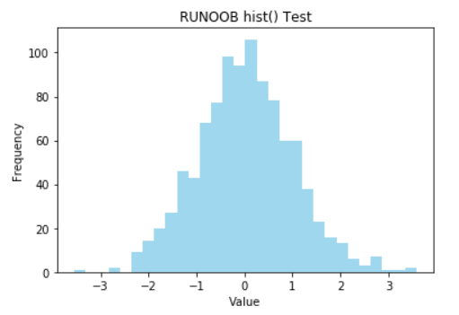 # 生成一组随机数据 data = np.random.randn(1000) # 绘制直方图 plt.hist(data, bins=30, color='skyblue', alpha=0.8) # 设置图表属性 plt.title('RUNOOB hist() Test') plt.xlabel('Value') plt.ylabel('Frequency') # 显示图表 plt.show()