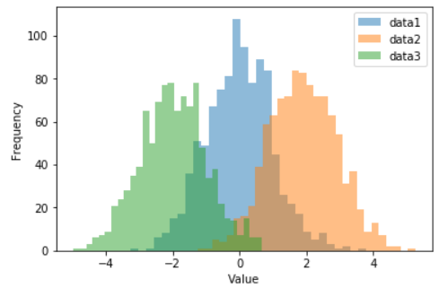data1 = np.random.normal(0,1,1000) data2 = np.random.normal(2,1,1000) data3 = np.random.normal(-2,1,1000) plt.hist(data1,bins = 30,alpha = 0.5,label='data1') plt.hist(data2,bins = 30,alpha = 0.5,label='data2') plt.hist(data3,bins = 30,alpha = 0.5,label='data3') plt.xlabel("Value") plt.ylabel("Frequency") plt.legend() plt.show()