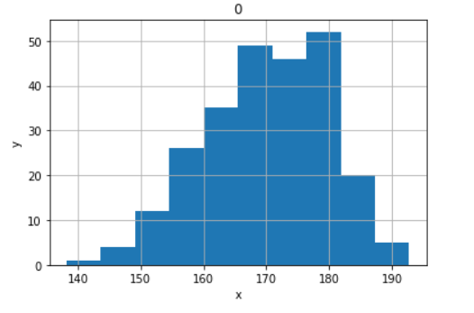 import pandas as pd random_data = np.random.normal(170,10,250) dataframe = pd.DataFrame(random_data) dataframe.hist() plt.xlabel('x') plt.ylabel('y') plt.show()