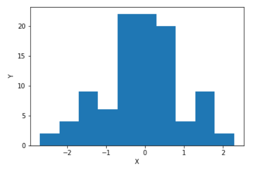 data = pd.Series(np.random.normal(size = 100)) plt.hist(data,bins = 10) plt.xlabel("X") plt.ylabel("Y") plt.show()