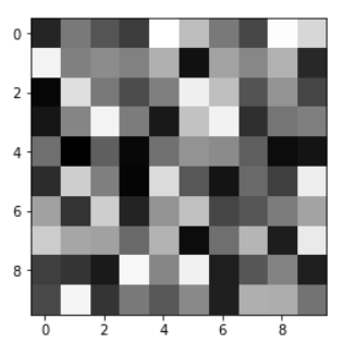 import matplotlib.pyplot as plt import numpy as np #生成一个二维随机数组 img = np.random.rand(10,10) #绘制灰度图像 plt.imshow(img,cmap='gray') plt.show()