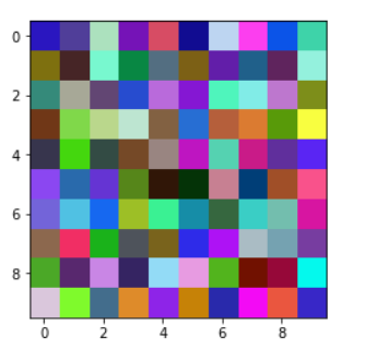 import matplotlib.pyplot as plt import numpy as np #创建一幅灰色的图像 img_gray = np.random.random((100,100)) #创建一幅彩色的图像 img_color = np.zeros((100,100,3)) img_color[:,:,0] = np.random.random((100,100)) img_color[:,:,1] = np.random.random((100,100)) img_color[:,:,2] = np.random.random((100,100)) #显示灰色图像 plt.imshow(img_gray,cmap='gray') #保存到硬盘总 plt.imsave("test_gray.png",img_gray,cmap='gray') #显示彩色图像 plt.imshow(img_color) plt.imsave("test_color.jpg",img_color)