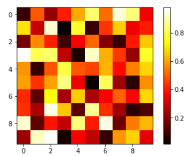 # 生成一个二维随机数组 data = np.random.rand(10, 10) # 绘制热力图 plt.imshow(data, cmap='hot') # 显示图像 plt.colorbar() plt.show()
