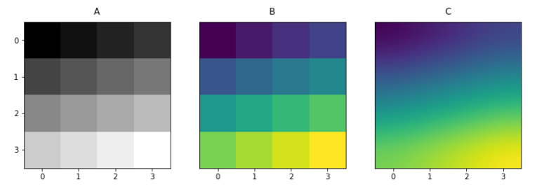 import matplotlib.pyplot as plt import numpy as np n = 4 #创建一个n*n的二维numpy数组 a = np.reshape(np.linspace(0,1,n**2),(n,n)) plt.figure(figsize=(12,4.5)) #第一章图展会上灰度的色彩映射方式,并且没有进行颜色的混合 plt.subplot(131) plt.imshow(a,cmap='gray',interpolation='nearest') plt.xticks(range(n)) plt.yticks(range(n)) #灰度映射,无混合 plt.title("A",y = 1.02,fontsize = 12) #第二张图展示使用viridis颜色映射的图像,同样没有进行颜色的混合 plt.subplot(132) plt.imshow(a,cmap='viridis',interpolation='nearest') plt.yticks([]) plt.xticks(range(n)) #viridis映射,无混合 plt.title("B", y = 1.02, fontsize = 12) #第三张图使用viridis颜色映射的图像,并且使用了双立方插值方法进行颜色混合 plt.subplot(133) plt.imshow(a,cmap='viridis',interpolation='bicubic') plt.yticks([]) plt.xticks(range(n)) #viridis映射,双立方混合 plt.title("C",y = 1.02,fontsize = 12) plt.show()