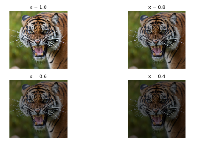 import matplotlib.pyplot as plt img_array = plt.imread('tiger.jpg') tiger = img_array/255 #显示图像 plt.figure(figsize = (10,6)) for i in range(1,5): plt.subplot(2,2,i) x = 1 - 0.2 * (i-1) plt.axis('off') plt.title("x = {:.1f}".format(x)) plt.imshow(tiger*x) plt.show()