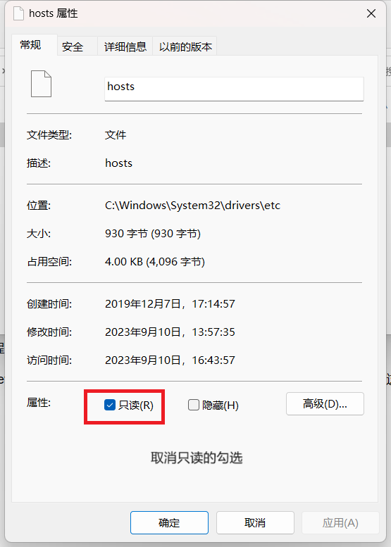 1.选中hosts文件右键属性进入以下界面,取消只读的勾选