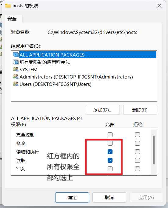 5.最后将hosts的权限恢复成只读,将修改和读入取消勾选。
