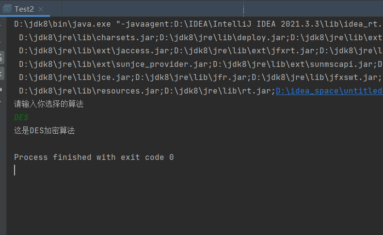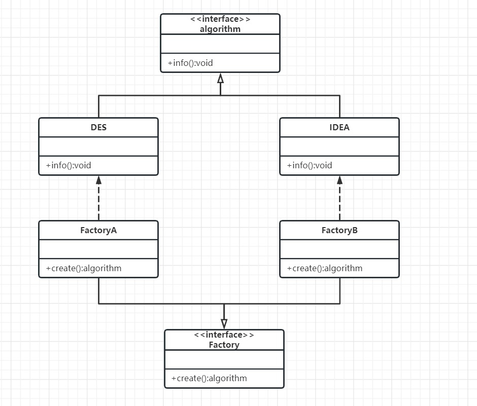 package test; import java.util.Scanner; public class Test2 { public static void main(String[] args) { System.out.println("请输入你选择的算法"); Scanner sc=new Scanner(System.in); String type=sc.next(); switch (type) { case "DES":Factory factoryDES=new FactoryDES();Algorithm algorithmDES=factoryDES.create();algorithmDES.info();break; case "IDEA":Factory factoryIDEA=new FactoryIDEA();Algorithm algorithmIDEA=factoryIDEA.create();algorithmIDEA.info();break; } } } interface Factory{ public Algorithm create(); } class FactoryDES implements Factory{ @Override public Algorithm create() { Algorithm algorithm=new DES(); return algorithm; } } class FactoryIDEA implements Factory{ @Override public Algorithm create() { Algorithm algorithm=new IDEA(); return algorithm; } } interface Algorithm{ public void info(); } class DES implements Algorithm{ @Override public void info() { System.out.println("这是DES加密算法"); } } class IDEA implements Algorithm{ @Override public void info() { System.out.println("这是IDEA加密算法"); } }