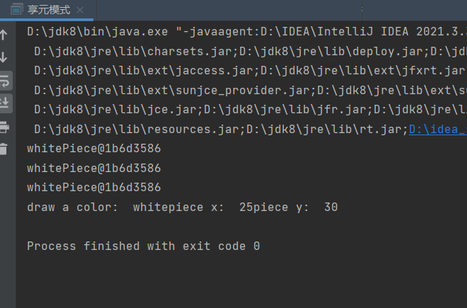 import java.nio.channels.Pipe; public class 享元模式 { public static void main(String[] args) { pieceFactory factory=new pieceFactory(); Piece whitePiece=factory.getPiece(0); Piece whitePiece1=factory.getPiece(1); Piece whitePiece2=factory.getPiece(0); System.out.println(whitePiece); System.out.println(whitePiece); System.out.println(whitePiece);//位于同一位置 whitePiece.draw(25,30); } } class pieceFactory{ private Piece[] pieces={new whitePiece(),new blackPiece()}; public Piece getPiece(int key) { if(key==0) return pieces[0]; else return pieces[1]; } } abstract class Piece{ protected String color; public abstract void draw(int x,int y); } class whitePiece extends Piece{ public whitePiece() { this.color="white"; } @Override public void draw(int x,int y) { System.out.println("draw a color: "+color+"piece x: "+x+"piece y: "+y); } } class blackPiece extends Piece{ public blackPiece() { this.color="black"; } @Override public void draw(int x,int y) { System.out.println("draw a color: "+color+"piece x: "+x+"piece y: "+y); } }