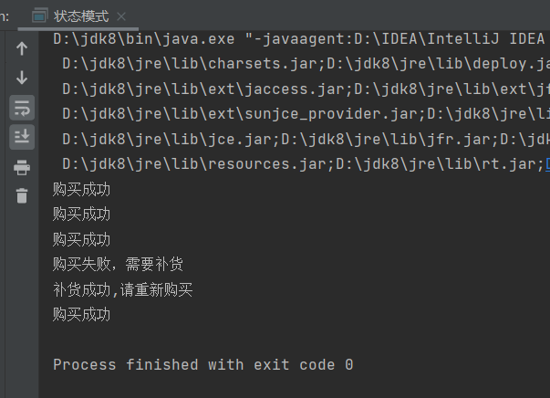 public class 状态模式 { public static void main(String[] args) { Context context=new Context(); context.Request(); context.Request(); context.Request(); //System.out.println(context.getState()); context.Request(); context.Request(); } } class Context{ private int index; private State state; public Context() { index=3; state=new StateA(); } public void setIndex(int index) { this.index=index; } public void setState(State state) { this.state=state; } public int getIndex() { return index; } public State getState() { return state; } public void Request() { state.Handle(this); } } interface State{ public void Handle(Context context); } class StateA implements State{ @Override public void Handle(Context context) { int index=context.getIndex(); if(index>=1) { System.out.println("购买成功"); index=index-1; context.setIndex(index); if(index==0) { context.setState(new StateB()); } }else System.out.println("购买失败"); } } class StateB implements State{ @Override public void Handle(Context context) { int index=context.getIndex(); if(index==0) { System.out.println("购买失败,需要补货"); index=index+5; System.out.println("补货成功,请重新购买"); context.setIndex(index); context.setState(new StateA()); } } }
