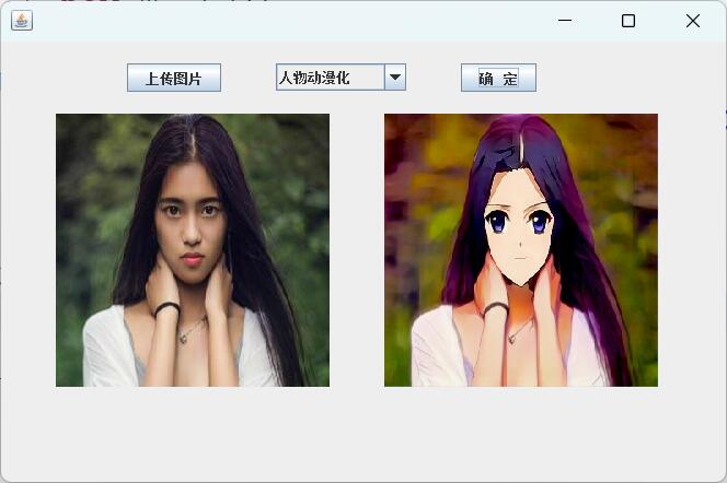 package tupian; import java.awt.FlowLayout; import java.awt.Image; import java.io.File; import javax.swing.JLabel ; import javax.swing.JPanel; import javax.swing.ImageIcon; import javax.swing.JButton; import javax.swing.JComboBox; import javax.swing.JFileChooser; import javax.swing.JFrame; import javax.swing.filechooser.FileNameExtensionFilter; public class Text3 extends JFrame { public String url=null;//上传的图片的路径 public String newImage=null;//添加特效或者增强后的图片 JPanel root =new JPanel(); //定义一个button点击之后 JLabel textlabel=new JLabel(" ");//使页面好看加的空格没什么用 JButton button1 =new JButton("上传图片"); JButton button2 =new JButton("确 定"); JLabel label =new JLabel(); JLabel label2 =new JLabel(); JComboBox<String> box=new JComboBox<String>();//下拉框 private int width = 250, height = 250; public Text3() { this.setContentPane(root); //流式布局页面 root.setLayout(new FlowLayout(FlowLayout.LEADING,50,20)); //下拉框添加属性 box.addItem("人物动漫化"); box.addItem("图像清晰度增强"); //组件添加到界面 root.add(textlabel); root.add(button1); root.add(box); //添加上传图片的点击事件 button1.addActionListener((e)->{ addpicture1(); }); //确定图片特效的点击事件 root.add(button2); button2.addActionListener((e)->{ addpicture2(); }); root.add(label); root.add(label2); } //文件选择器 public void addpicture1() { JFileChooser chose=new JFileChooser(); //文件过滤器 只能选择图片文件 FileNameExtensionFilter filter =new FileNameExtensionFilter("图片文件", "jpg"); chose.setFileFilter(filter); //显示文件选择器 int ret =chose.showOpenDialog(this); //获取用户的选择结果 if(ret == chose.APPROVE_OPTION) { //结果为已经存在的一个文件 File file=chose.getSelectedFile(); //获取选择的图片的路径 url=file.getAbsolutePath(); //上传图片,将图片展示在窗体上 ImageIcon image = new ImageIcon(url); Image img = image.getImage(); img = img.getScaledInstance(width, height, Image.SCALE_DEFAULT); image.setImage(img); //设置图片的长宽 label.setIcon(image); label.setSize(width,height); } } //选择特效或增强的点击事件 public void addpicture2() { int flag=0; if(box.getSelectedIndex()==0) { //人物动漫化 newImage=Text1.selfie_anime(url); }else if(box.getSelectedIndex()==1) { //图像清晰度增强 newImage=Text2.image_definition_enhance(url); } try { //上传图片 ImageIcon image = new ImageIcon(newImage); Image img = image.getImage(); img = img.getScaledInstance(width, height, Image.SCALE_DEFAULT); image.setImage(img); //设置图片的长宽 label2.setIcon(image); label2.setSize(width,height); } catch (Exception e1) { // TODO Auto-generated catch block e1.printStackTrace(); } } public static void main(String[] args) { //jfram指的是一个窗口 // myframe frame=new myframe(); //子类继承父类所以可以直接声明 JFrame test=new Text3(); //当关闭窗口时候退出整个程序 test.setDefaultCloseOperation(JFrame.EXIT_ON_CLOSE); //设置窗口大小宽高 test.setSize(680,450); //显示窗口 test.setVisible(true); } }