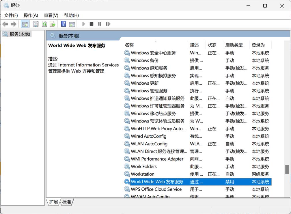 1.点击开始收索服务,在服务界面找到world Wide Web发布服务 右键关闭,双击禁用