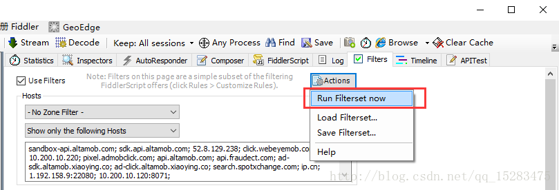 - 打开后我们可以看到下面的Host模式,下拉框按如图选择。表示我们只在Fiddler上显示以下域名的数据请求。
