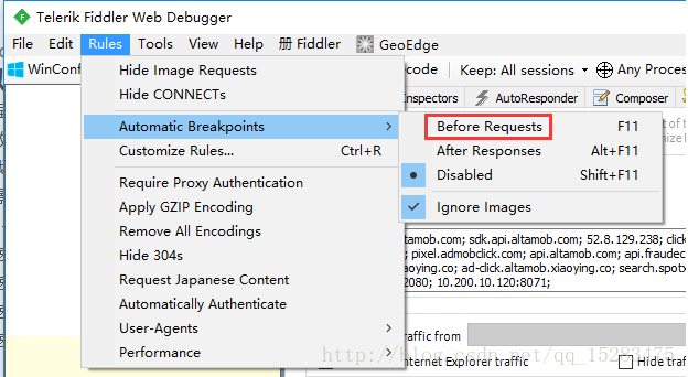 打开Fiddler,Rules->Automatic Breakpoints ->点击 Before Requests ,这样所有的请求在发送请求之前就被阻止了