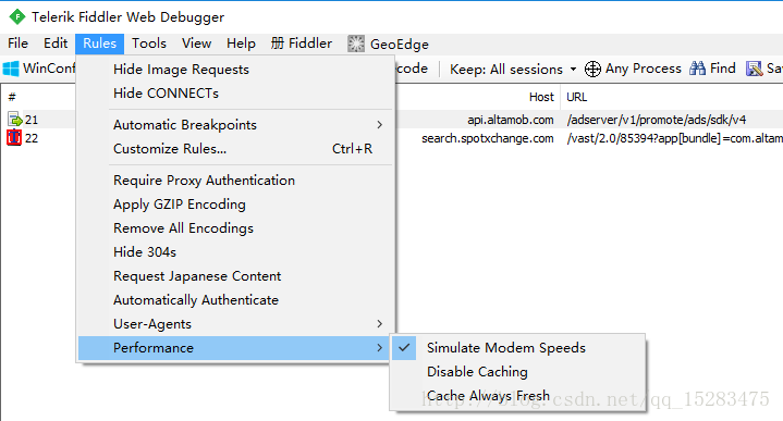 打开Fiddler,Rules->Performance->勾选 Simulate Modem Speeds,之后,你会发现网络变得超级慢。