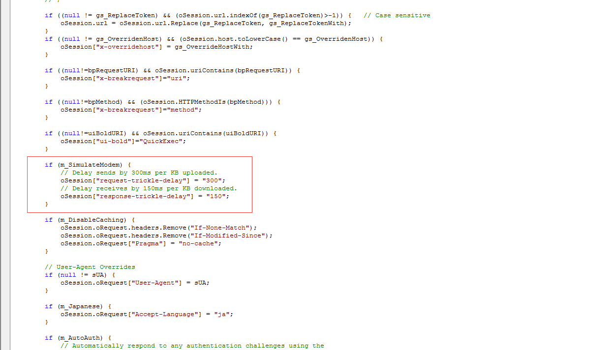 if (m_SimulateModem) { // Delay sends by 300ms per KB uploaded. oSession["request-trickle-delay"] = "300"; // Delay receives by 150ms per KB downloaded. oSession["response-trickle-delay"] = "150"; }