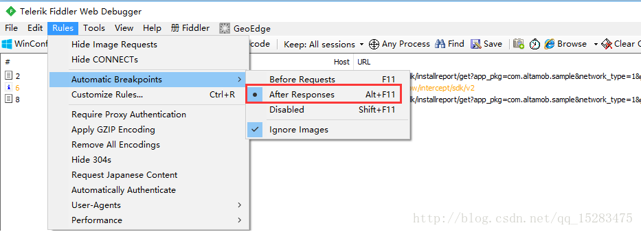 若是修改响应的数据,应该在after response 打断点,故打断点的步骤是,Rules->Automatic Breakpoints -> After Responses,这样响应结果就被阻止