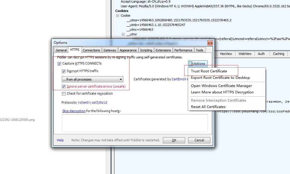 首先对Fiddler进行设置:打开工具栏->Tools->Fiddler Options->HTTPS,安装相应的证书DO_NOT_TRUST_FiddlerRoot