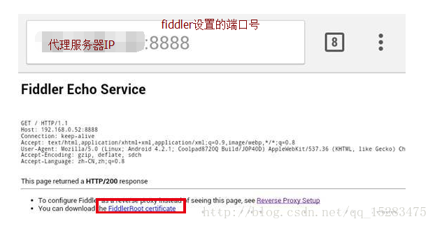 然后就是手机上安装证书。打开手机浏览器,在浏览器地址输入代理服务器IP和端口,会看到一个Fiddler提供的页面。接着点击最下方的FiddlerRoot certificate,这时候点击确定安装就可以下载Fiddler的证书了。