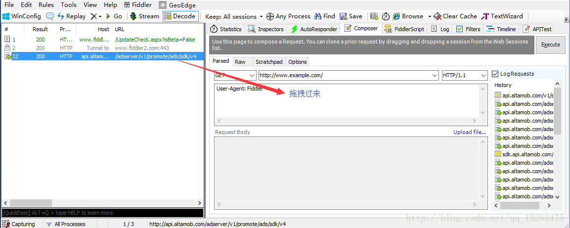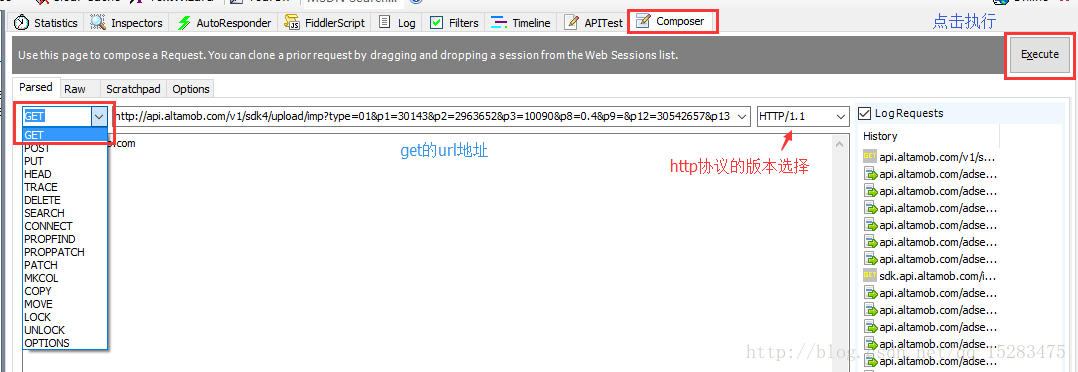 打开Fiddler工具,在右侧点击“composer”的选项,在parsed中选择get请求,之后填写get的url地址及相关的参数,再选择http协议的版本,最后点击execute按钮。