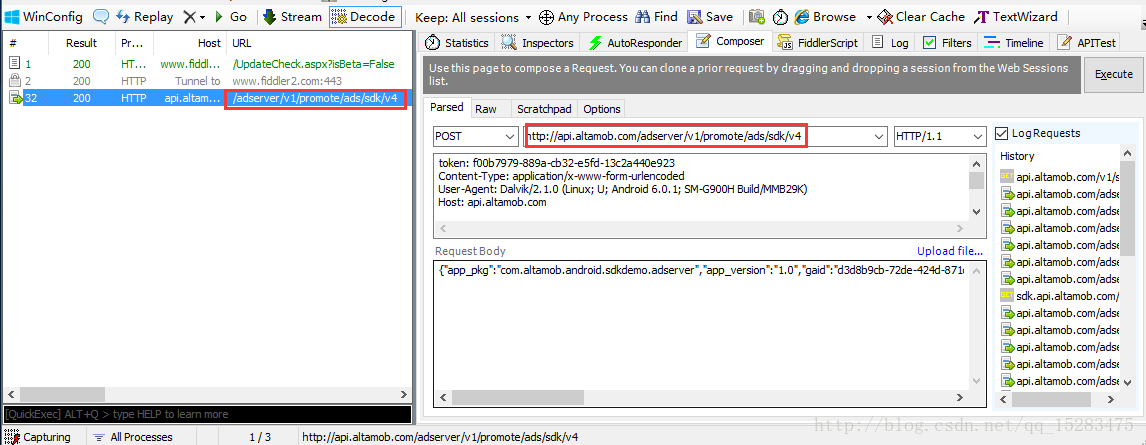 打开Fiddler工具,在右侧点击“composer”的选项,在parsed中进行根据http发送的请求进行选择,我们是模拟post请求,故选择post,添加post的url地址,以及选择http协议的版本,填写post请求的header和body,最后点击 Execute,就可以发送post请求,在左侧可以查看到发送的请求记录。双击该请求,既可以查看详细的请求数据和返回结果。