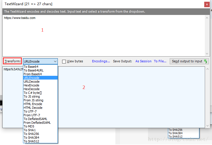 弹出TextWizard窗体,在1区域填写要加码或者解码的文本,在Transform选中选择要转换的方式,就会在区域2中显示结果,本图的例子是对 https://www.baidu.com 进行urlencode 加密